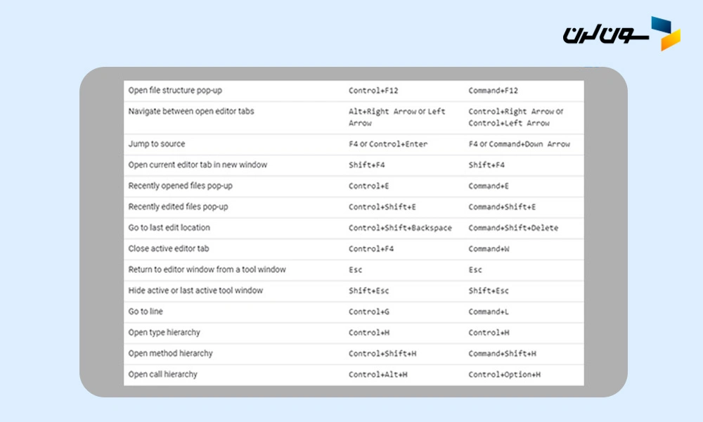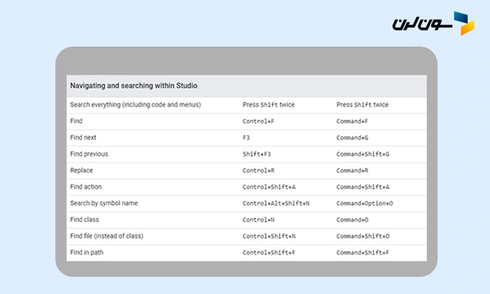 میانبرهای جستجویی: با استفاده از این میانبرها میتوانید بین کلاسها و فایلهای خود جستجو کنید و یا جا به جا شوید.