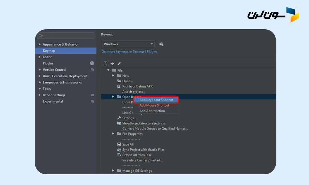 در پنجره باز شده، بخشی که مربوط به آن عملیات است را پیدا کرده و سپس روی عملیات مورد نظر کلیک راست میکنیم و گزینه Add Keyboard Shortcut و یا گزینه Add Mouse Shortcut را انتخاب میکنیم.