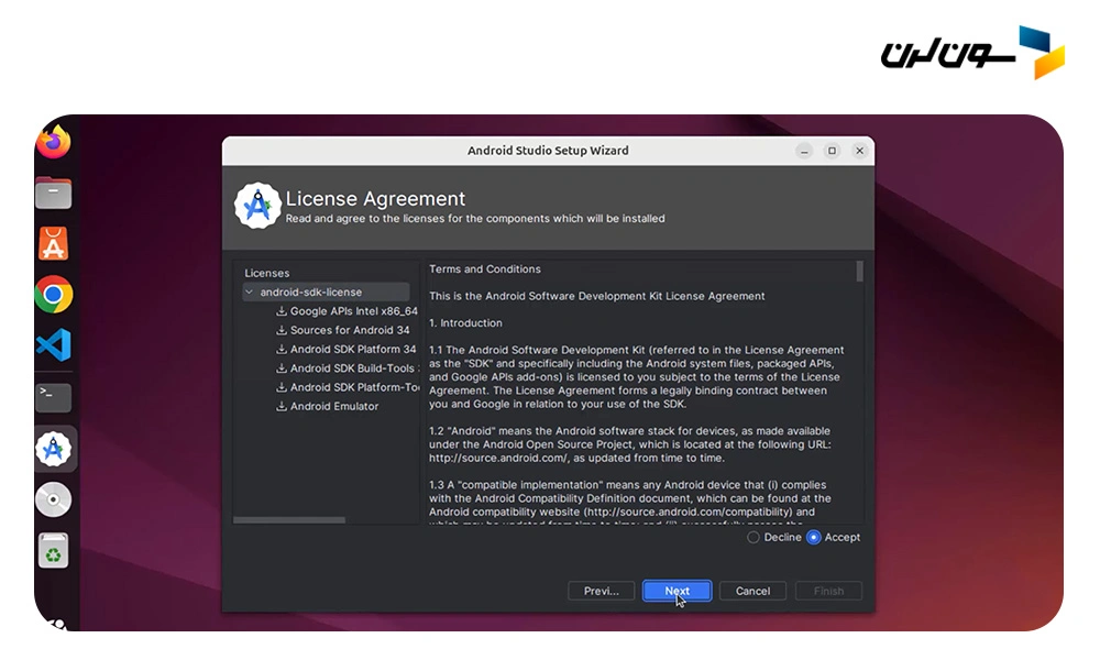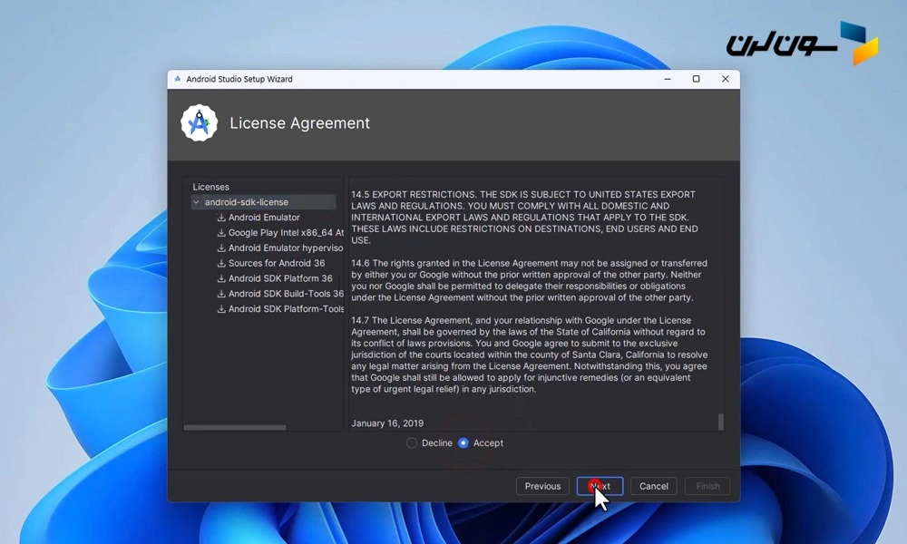 در بخش License، گزینه Accept را انتخاب کنید. Android Studio شروع به دانلود و نصب کامپوننتهای لازم (SDK، Emulator و…) میکند.