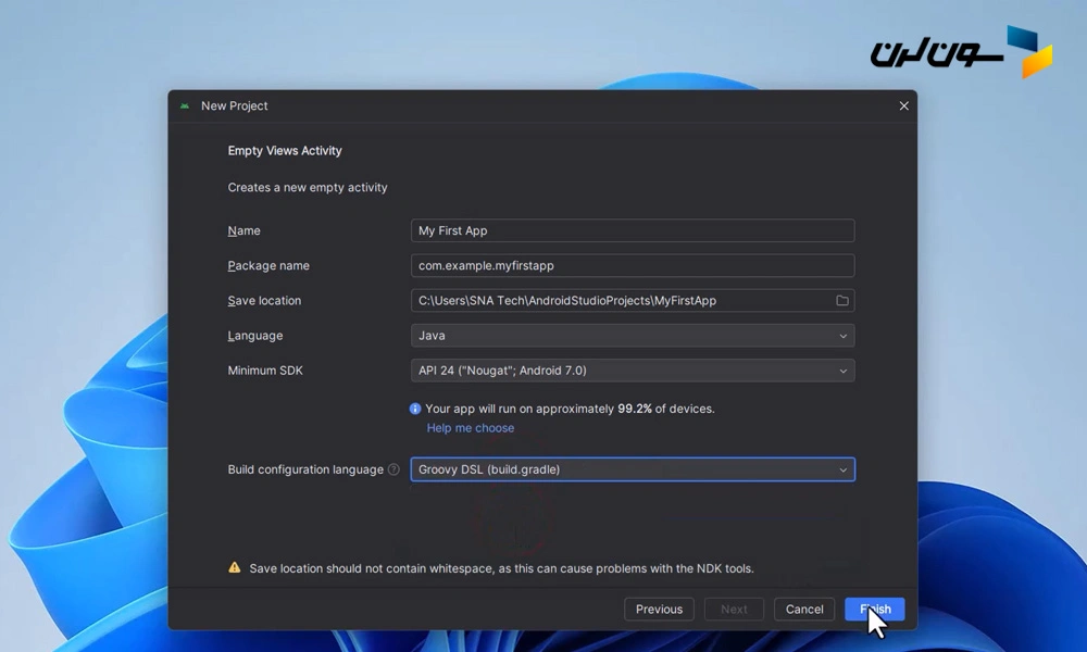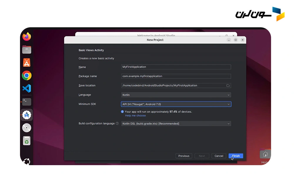 در پایان، روی Finish کلیک کنید تا وارد صفحه اصلی خوشآمدگویی Android Studio شوید.