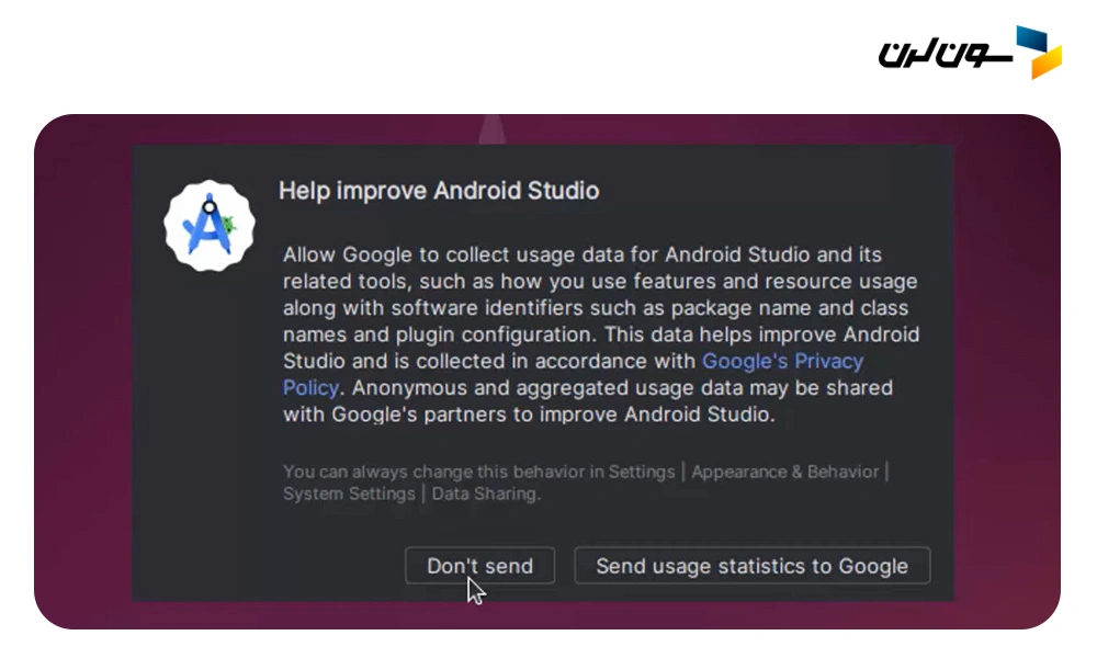 وقتی Android Studio برای اولین بار اجرا میشود، پنجرهای برای Help Improve Android Studio نمایش داده میشود؛ گزینه Don’t Send را انتخاب کنید.