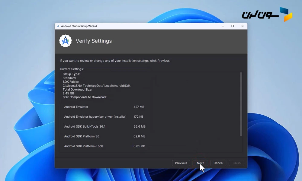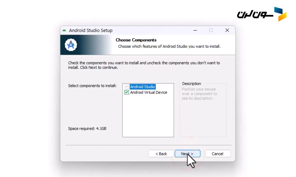 در صفحه SDK Components Setup (شامل Android SDK، Emulator و Platform Tools)، همه گزینهها را انتخابشده نگه دارید و Next را بزنید.
