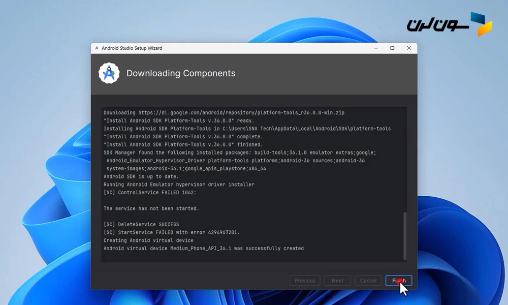 پنجره Downloading Components نمایش داده میشود؛ Android Studio شروع به دانلود و نصب اجزای لازم میکند. صبر کنید تا کامل شود.