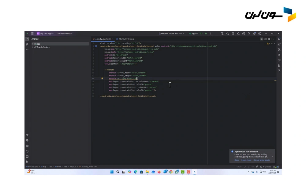 از نوار ابزار بالای Android Studio، قبل از اجرای برنامه، متن پیشفرض Hello World را به نام اپ (مثلاً MyFirstApp) تغییر دهید.