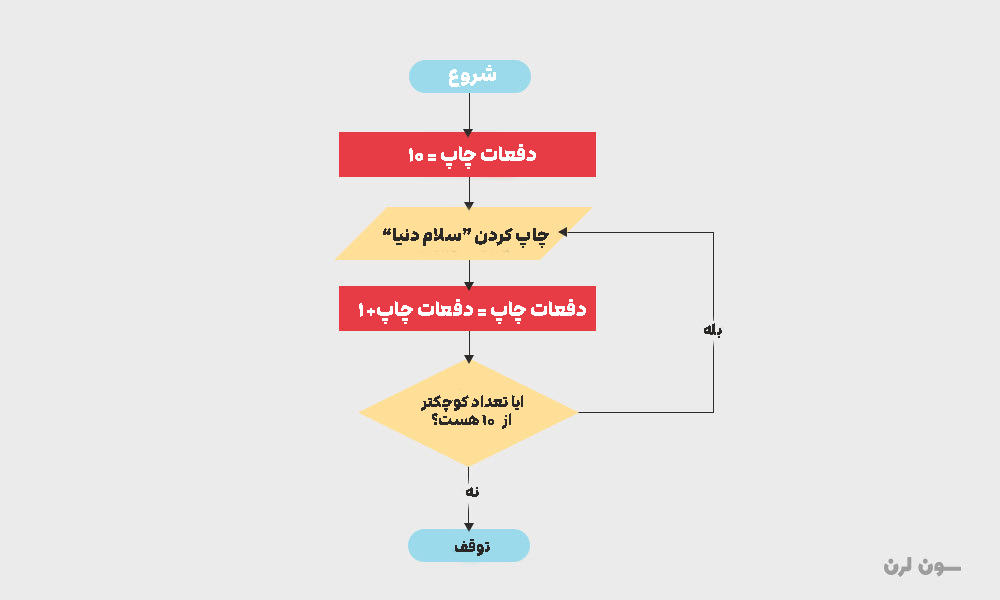 چک میکنیم که آیا مقدار جدید شمارنده کمتر از 10 است یا خیر. اگر کمتر بود به مرحله 3 میرویم در غیر این صورت به 6.