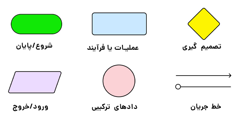 گفتیم که برای کشیدن فلوچارت از مجموعه شکلهای قراردادی استفاده میکنیم که هرکدام در نمایش دستورات مختلف یک برنامه نقش دارند. چند نمونه از بارزترین نمادهای فلوچارت را در این بخش معرفی میکنیم: